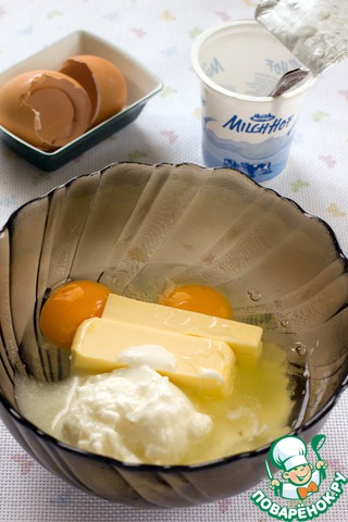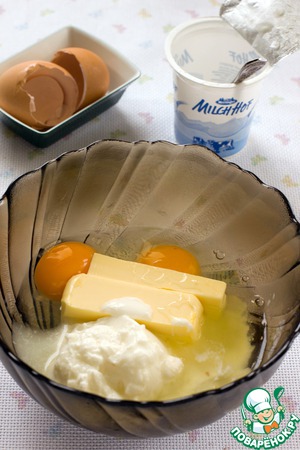 В другой посуде соединить йогурт (кефир, сметану), масло и яйца.