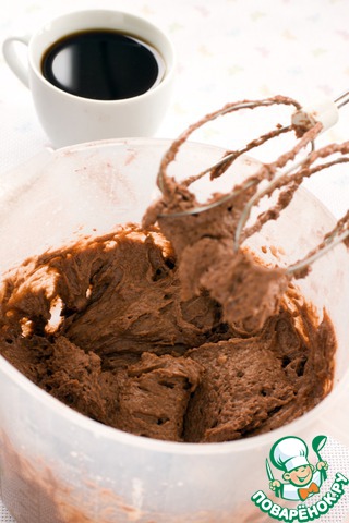 Соединить сухую и жидкую смесь вместе, в самом конце добавить чашку горячего кофе, смешать кратко при помощи миксера или венчика, лишь до объединения ингредиентов.