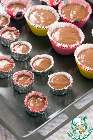 Распределить по формочкам. Для части манжеток у меня не было подходящих форм, поэтому просто сделала стаканчики из фольги и вставила внутрь эти маленькие манжетки. Выпекать при 180 С 25-30 минут или до сухой лучины.