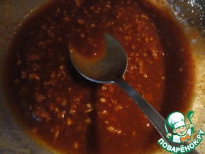 Добавляем к маринаду чеснок, имбирь, свежемолотый черный перец, карри и 1 чайную ложку томатной пасты из маленькой пачки.