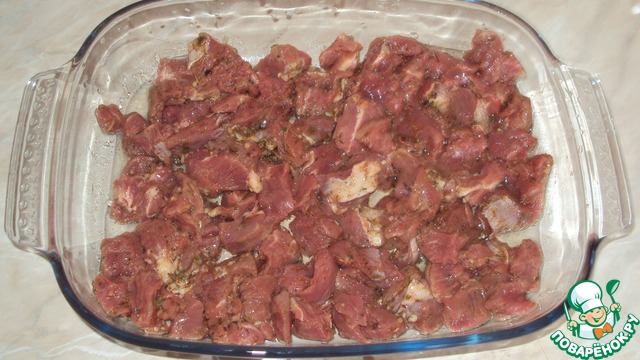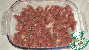 Нарезаем баранину кусочками, добавляем 2 ст. ложки масла в противень и выкладываем баранину.