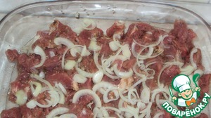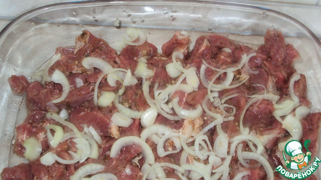 Далее нарезаем полукольцами лук, выкладываем на баранину.