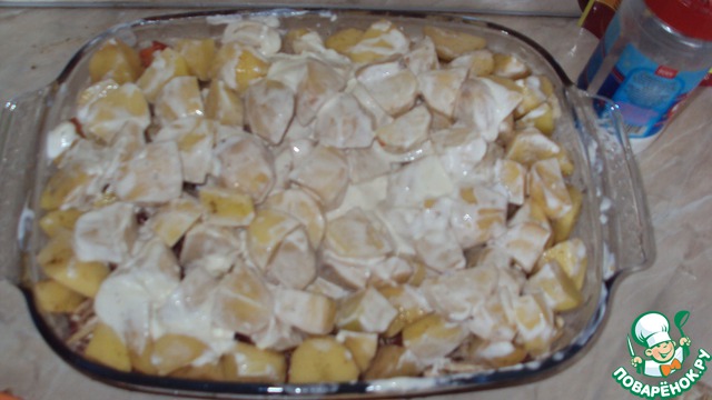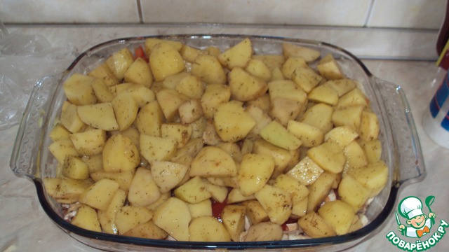 Нарезаем картофель дольками, выкладываем поверх помидоров и присыпаем специями, я брала для картофеля и для мяса.