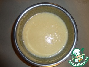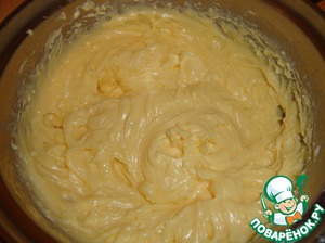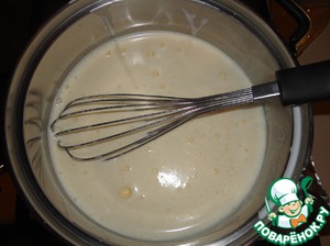 Затем перельем получившуюся массу в кастрюлю с молоком, поставим на огонь. Постоянно помешивая, заварим крем. Крем закроем пищевой пленкой так, чтобы она касалась крема. Остудим, на часик поставим в холодильник. Остальные этапы приготовления крема сделаем позже.