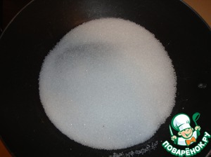 Сделаем пралине. Для этого в сковороду с антипригарным покрытием положим 50 г сахара. Помешивая, ждем, пока сахар полностью растопится.