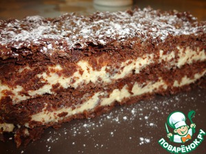 Собираем мильфей. Кладем первый корж, затем половину крема. Следом второй корж и вторая половина крема. Завершаем третьим коржом и посыпаем сахарной пудрой.