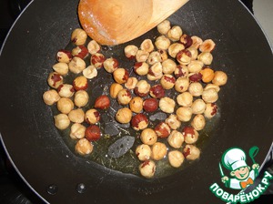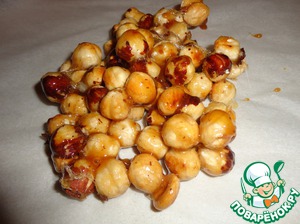 Затем в растопленный сахар добавляем фундук и деревянной ложкой перемешиваем, чтобы карамель хорошо смешалась с орехами. Важно не передержать карамель на огне, чтобы она не начала горчить.