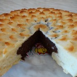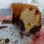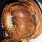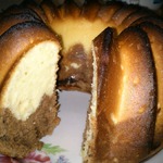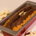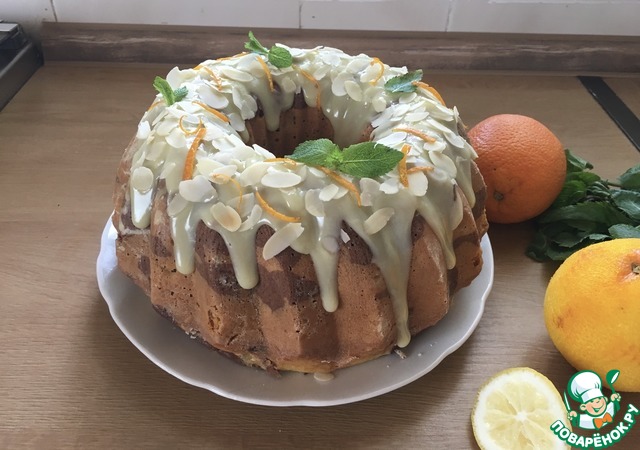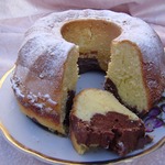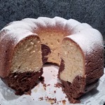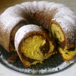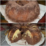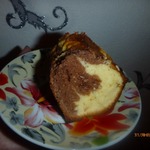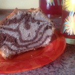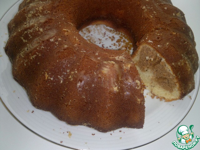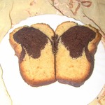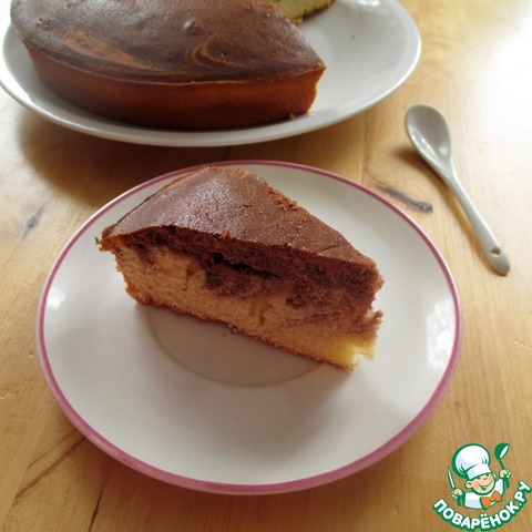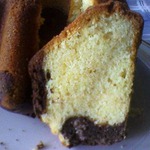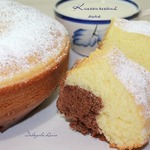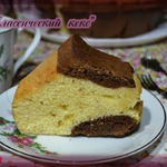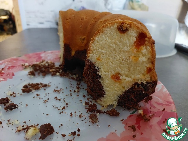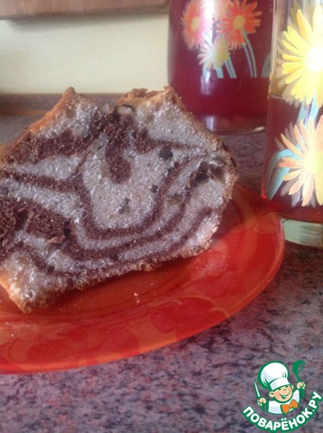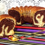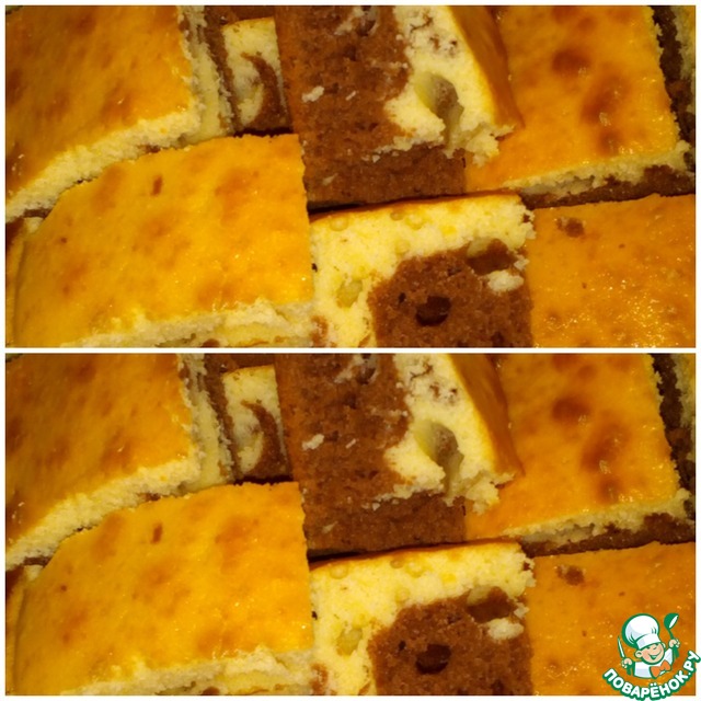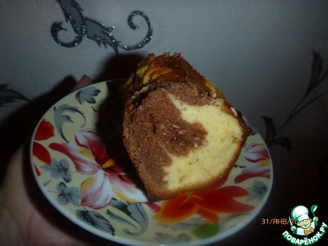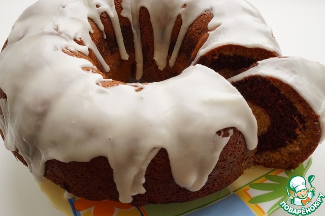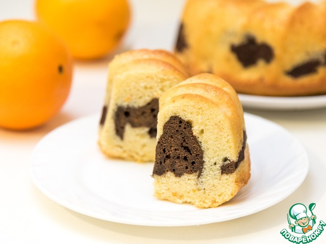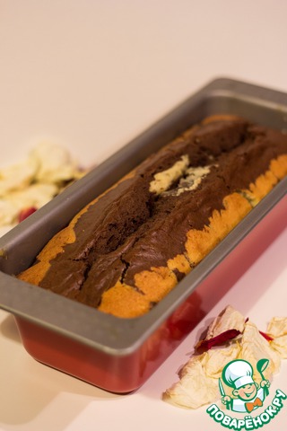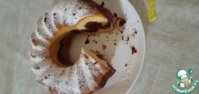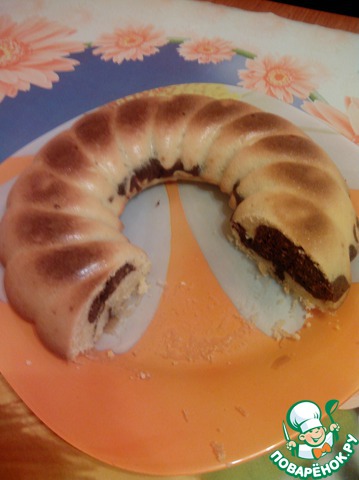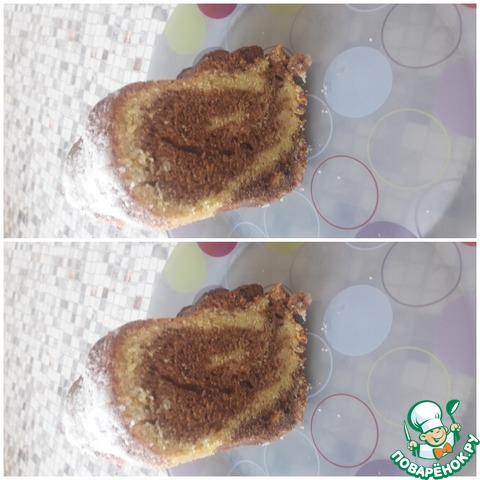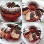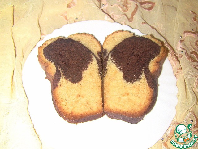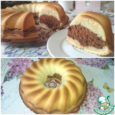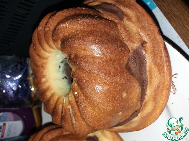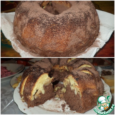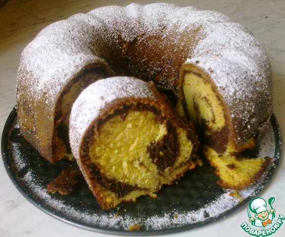 Форму с трубкой (26 см. в диаметре) тщательно смазать маргарином (каждый рубчик) и присыпать мукой, перевернуть и легко постучать краем, чтобы удалить лишнюю муку. Поместить в форму белую часть теста, а сверху шоколадную.