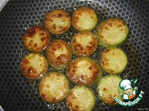 Обжарить кабачки в разогретом растительном масле. Многие обваливают кабачки в муке, но я так не делаю, мне кажется, мука "утяжеляет" это блюдо.