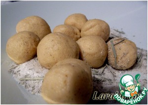 Ложечкой (чайной) берём тесто и руками скатываем комочки. Величиной с грецкий орех...