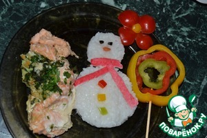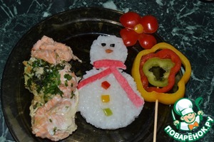 У меня получилось так: слева наш кармашек (получилось ароматно и нежно), снеговик украшен шарфиком из крабовой палочки, пуговки из перцев, глазки из маслины, нос, ка полагается, из морковки. Цветочек сверху из перчика, справа - разные по диаметру кружочки из перцев, нанизанные на шпажку.