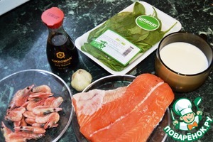 1. Подготовили все необходимые ингредиенты: промыли филе, креветки, достали молоко, соевый соус, чеснок, шпинат. Укроп и соль остались за кадром. Количество продуктов довольно условно: всё на ваш вкус.