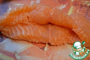 2. Филе лосося очищаем от кожи. Режем на порции. Ножиком проделываем кармашек: боковую часть куска режем примерно до серединки, но не до конца.