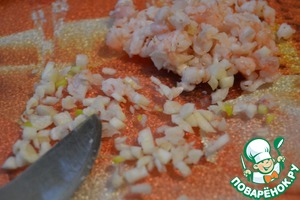 3. Рубим мелко уже очищенные креветки. Измельчаем чеснок. Для аромату можно придавить его боковой стороной ножа.