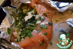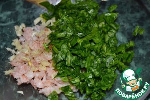 6. Собственно, почти всё. Наполняем "карманы" нашей рыбки смесью из креветок, чеснока и шпината. Немного солим.