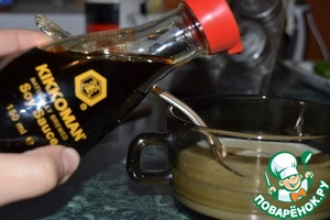 7. Настал черёд соуса. Готовим смесь из молока, двух столовых ложек соевого соуса, добавляем немного укропа.