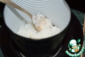 10. Где-то в начале своего рассказа, пункте так на втором, я поставила вариться рис. Рис - лучший гарнир к рыбе. Будем подавать его в новогоднем антураже, в виде нетающего снеговика) На помощь мне приходит кольцо для салфеток и вот такая самоделка, о которой все наверняка знают: прорезанная насквозь консервная банка. Наполняем и утрамбовываем туда рис.