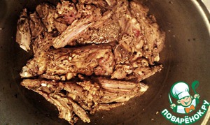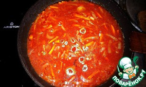 • Полученный соус вливаем в казан, доводим до кипения и томим ещё час, у меня время было, гости задерживались, поэтому вышло 1,5-2 часа ещё.