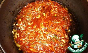 • На сковороде обжариваем морковь с луком, добавляем томат, создаём кисло-сладкий вкус и загустеваем с помощью муки.