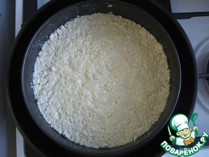 2. Творог растереть с 1 яйцом, добавить 2,5 ст. л. сахара и 2 ст. л. манной крупы, перемешать. Форму смазать сливочным маслом и выложить в нее творог, хорошо утрамбовать его ложкой.