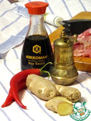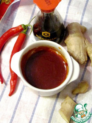 Для соуса нам понадобятся снова соевый соус Kikkoman, имбирь (кусочек размером с большой палец руки), чеснок, немного перца чили, сахар, ананас.