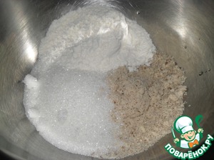 Начнем с приготовления бисквита. 60 г молотого миндаля смешать с 60 г сахара и 60 г муки.