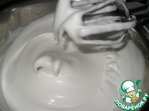 Взбить 4 белка и 70 г сахара до получения мягких пиков и по частям ввести в желтковую массу.