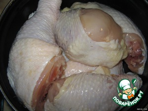 Нарезаем курицу или окорочка любыми кусочками. Целую курицу можно не резать.