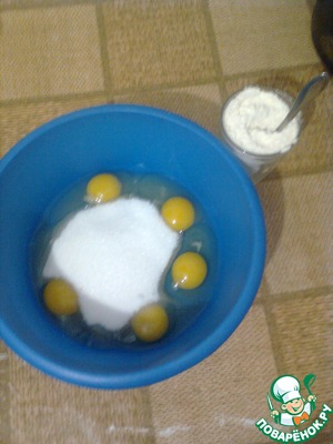 Яйца и сахар всыпать в миску вместе и взбить. Заметьте, вместе желтки с белками, а не отдельно.