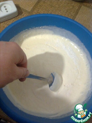 Теперь понемногу вводим муку с разрыхлителем теста. По 1 ст. лож. Медленно перемешивая в одну сторону.
