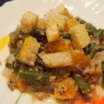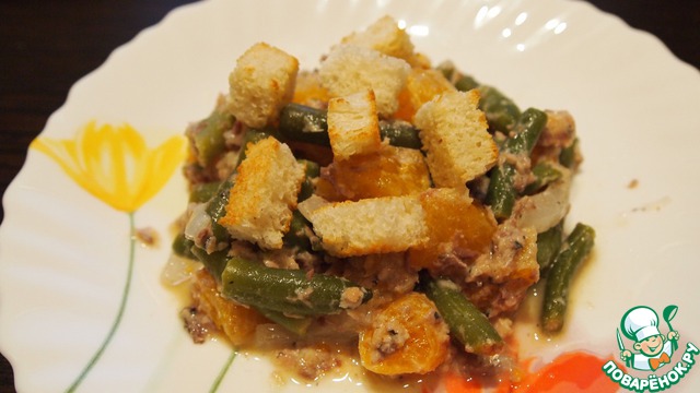 Пока наши сухарики румянятся в духовке, а потом остывают, мы подготавливаем следующие ингредиенты. Варим минут 8 стручковую фасоль (у меня была замороженная), потом окунаем в холодную воду, чтобы предотвратить процесс варки и чтобы фасоль оставалась зеленой. Я, к сожалению, немного протормозила и окунала слишком поздно. А так, фасоль должна получиться более изумрудной.