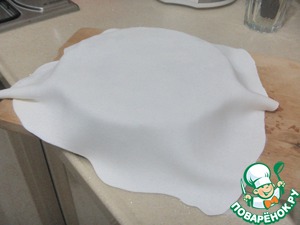 Раскатываем мастику тоненьким слоем (примерно в пару мм). Обворачиваем скалку раскатаной мастикой и выкладываем ее на торт. При это ровняем поверхность торта.