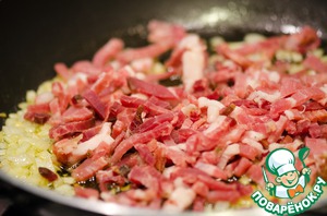 • Тем временем жарим лук на оливковом масле, затем добавляем к нему мелко нарезанную корейку (я использовала в упаковке, нарезанную соломкой) и продолжаем жарить минут 5.