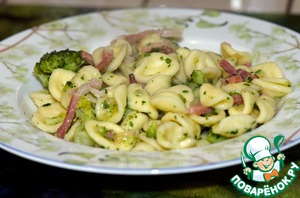 Готовлю по этому рецепту уже давно, но только сейчас добавляю фото. Макаронные изделия пробовала разные и брокколи использовала и свежую, и замороженную - всегда вкусно. Единственное, корейку все-таки предпочитаю брать более толстой нарезки, чтобы были видны кусочки. В общем, это замечательный рецепт пасты!