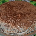Начинаем собирать торт: кладем блин поливаем его кофейной смесью (1-2 ч. л.), даем впитаться и наносим крем. Так поступаем с каждым блинчиком. После того, как положили последний блин, обмазываем верх и бока торта кремом и посыпаем через сито какао. Все! Есть можно сразу, но, как и любому торту, лучше постоять хотя бы пару часиков.