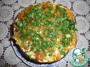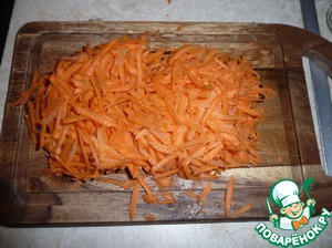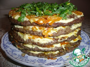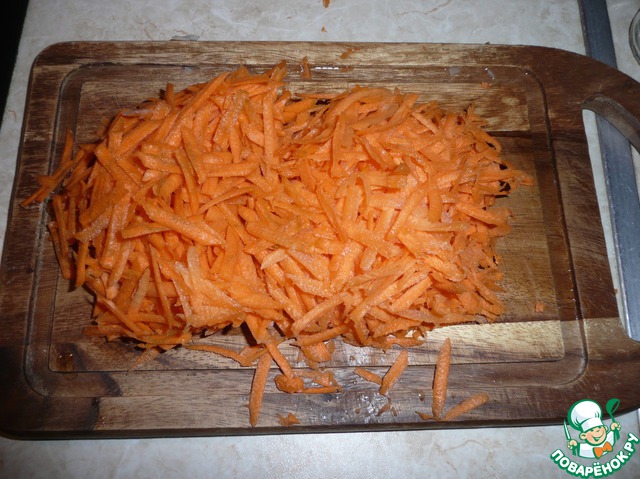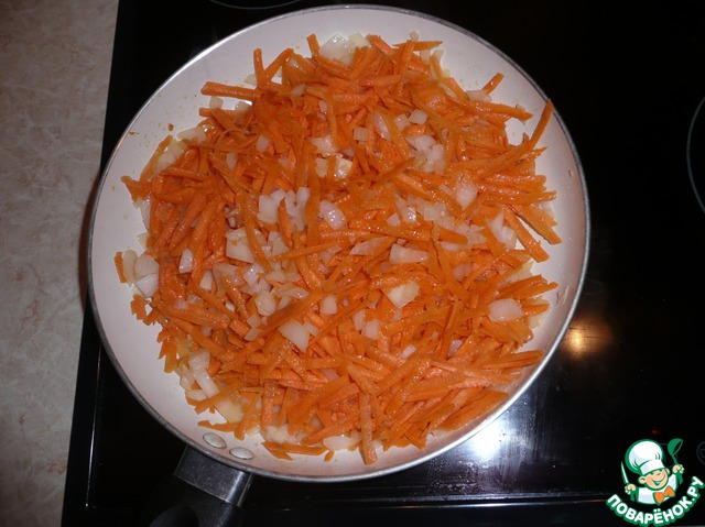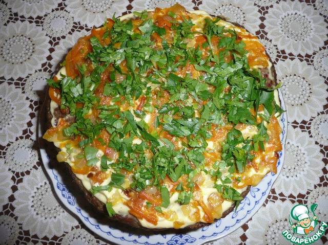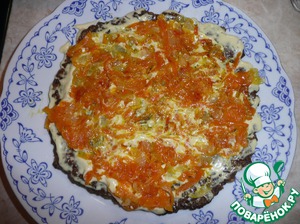 Выложить морковь с луком. И так далее все блинчики выложить слоями.