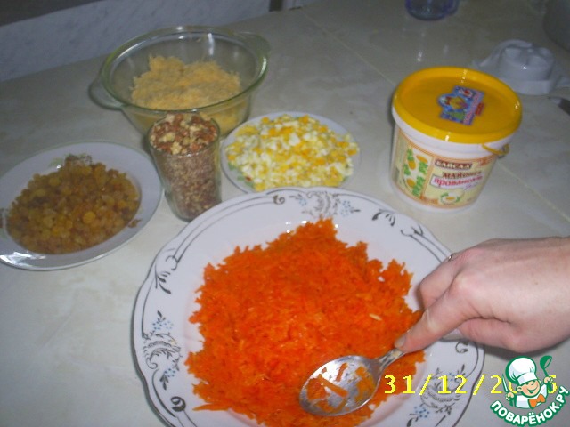 Морковь натереть на крупной терке, яйца мелко порезать, орехи подробить, но не в мелкий порошок, сыр натереть на мелкой терке и перемешать с пропущенным чеснок.