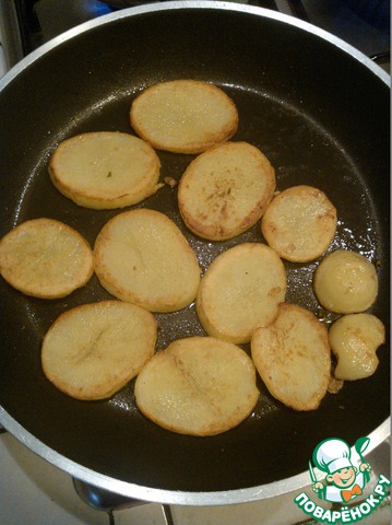 Берём большой картофель, сваренный в мундире и режем его поперёк кружочками. Затем обжариваем его до золотистого цвета на свином жиру (сале), я использовала столовую ложку оного. Можно также использовать масло растительное, сливочное - кто-что предпочитает.
