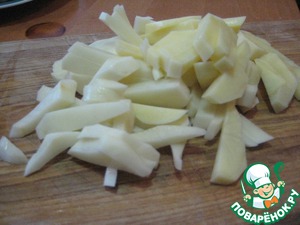 Нарезаю дольками картофель - мои 3 картофелины весят примерно 220г. (здесь и во всем рецепте не важно в какой форме и в каком размере нарезаны овощи, т. к. все овощи успевают провариться). Только помните, что маленькие кусочки варятся быстрее, чем крупные.