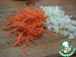 Морковь (вес 66г) натираем на терке, лук и болгарский перец режем кубиками (по 63г).