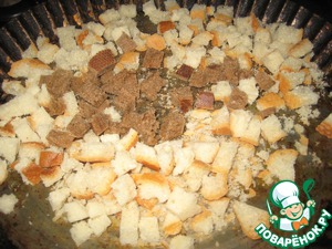 Итак, берем несколько кусочков разного хлебушка (мои любят в этом супе и черные, и белые сухари), я взяла 5 кусочков. Нарезаем на кубики и бросаем в разогретую до 220-200град. духовку, минут на 5. -