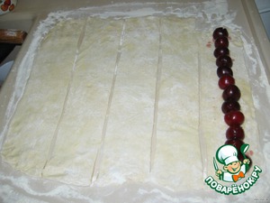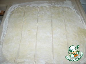 Раскатать тесто в форме "квадрата" толщиной в 3-5мм. Нарезать его полосками шириной 6-7см.