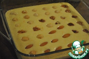 Форму смазываем маслом и посыпаем манкой. Выливаем тесто и в духовку, разогретую до 180 градусов на 25 минут, ориентируйтесь на золотистую корочку.