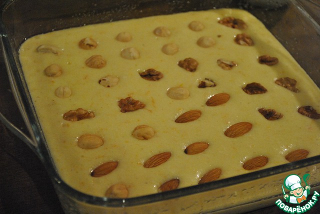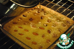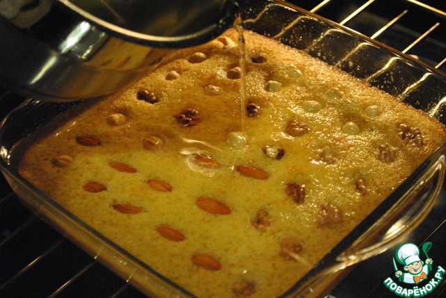 Когда наш шамбали пропекся, выключаем духовку, достаем противень и заливаем сиропом (щербетом) отправляем обратно в духовку, пусть постоит 5-10 мин. Это позволяет сиропу быстро впитаться.