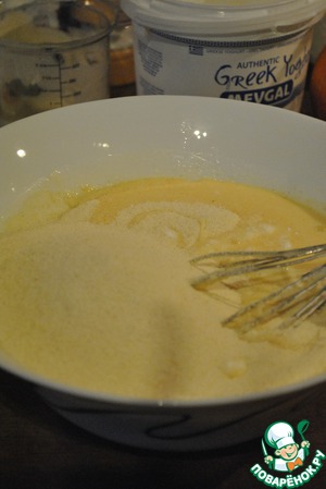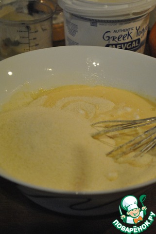 Добавляем йогурт, масло растительное, перемешиваем. Затем добавляем манку, разрыхлитель, щепотку ванилина.