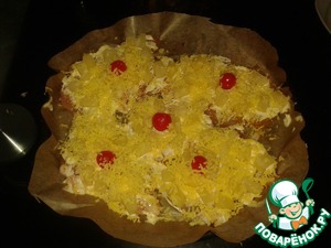 Посыпать натертым на мелкой тёрке сыром. Запекать куриные грудки при температуре 180 градусов в течение 30 минут.
