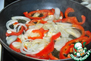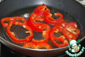 Сковороду протираем, наливаем ещё 2 ст. ложки масла, обжариваем 1 минуту сладкий красный перец.