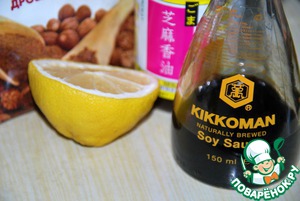 Берём соевый соус "Киккоман", кунжутное масло, лимон (сок от половины лимона), мускатный орех.