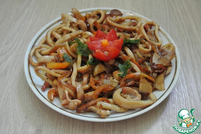 Лучше всего готовить это блюдо на воке, но за неимением можно использовать обычную сковороду. На раскалённом масле (2 ст. ложки) обжариваем кальмаров 2-3 минуты и убираем со сковороды.
