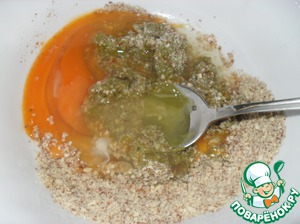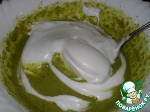 Бисквит: смешать 100 г молотого миндаля, 50 г фисташковой пасты, 1 яйцо,1 белок и 2 желтка. Взбить до получения густой и пышной массы. Затем добавить 45 г кукурузного крахмала и 20 г растопленного сливочного масла.